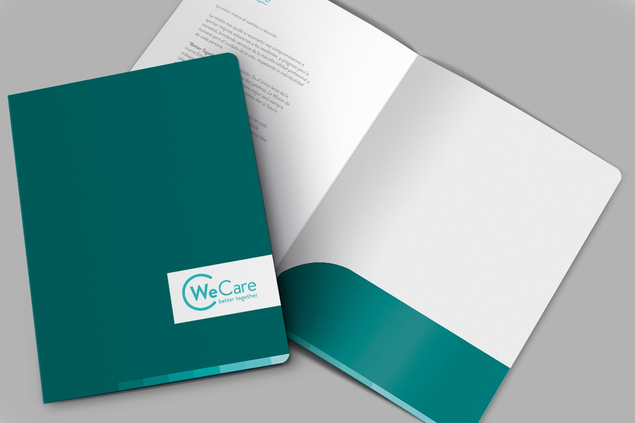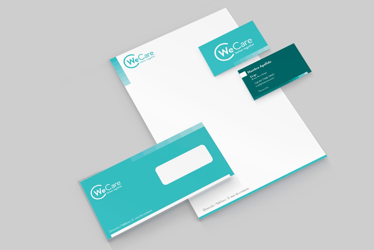 We Care es una empresa nueva que necesitaba crear un manual de marca. En el mismo se crearon todas las variantes de su logotipo, sus diferentes utilizaciones y aplicaciones, como así también se trabajó en la papelería institucional, lo que incluye sobres, carpetas, hojas membretadas, tarjetas personales y otras piezas que refuercen la imagen que se quiere transmitir.